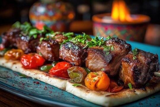 Charred Lamb Kuzu Sis Skewers on Lavash with Grilled Vegetables