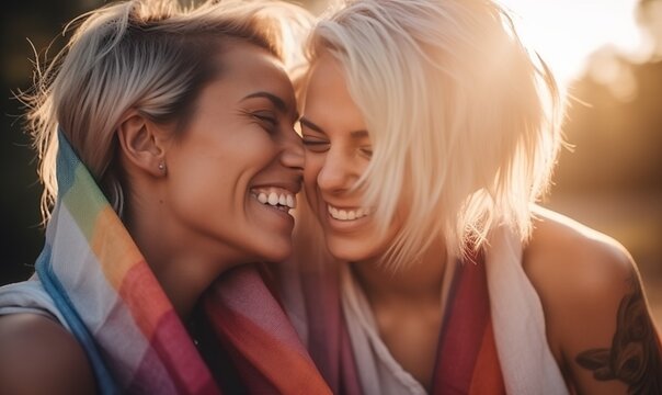 LGBT lesbian couple, love moments, happiness concept, two women hugging, LGBT flag