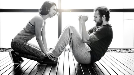 Fit individuals doing sit-up exercise in crossfit gym