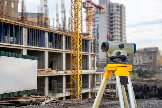 Geodetic instrument. Building under construction. Optical theodolite. Geodetic device on tripod. Construction site without anyone. Equipment for surveyor. Geodetic quality control of construction