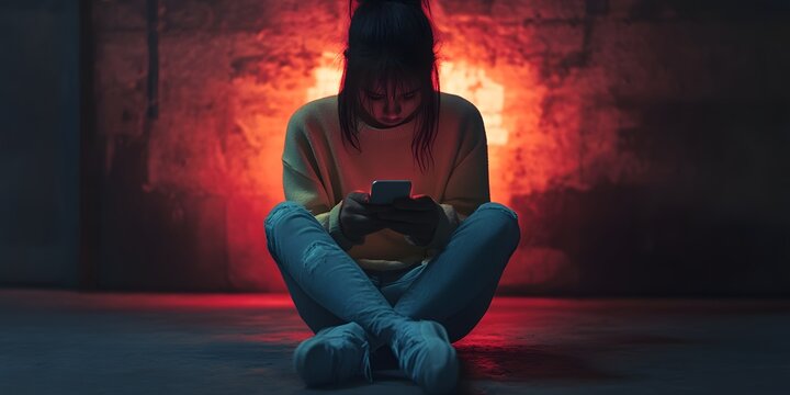 A young woman sitting cross legged using her phone with a red smoky background in a dark room setting