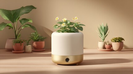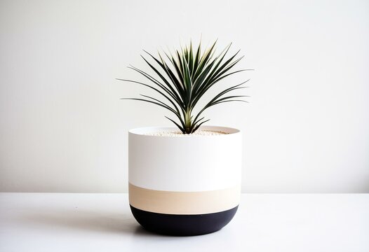 A terracotta planter with a small plant inside, sitting on a white background. The earthy tones and simple design create a calm and serene atmosphere.