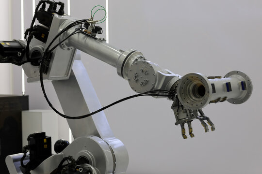 Industrial robot arm in a factory setting White six-axis design with flexible joints and gripper mechanism Blurred industrial background Artificial lighting