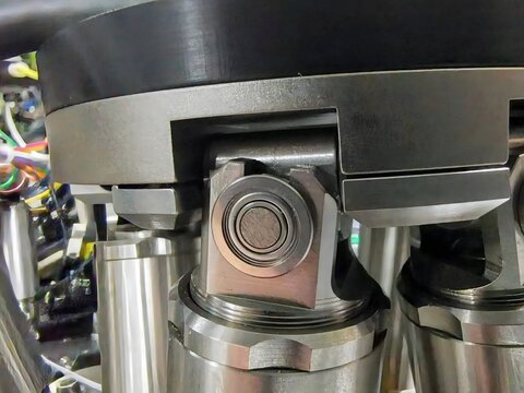 Showing flat design 6-axis robot arm in lab featuring safety frame touchscreen console and sensors