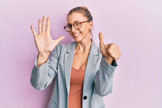 Caucasian woman wearing lingerie over pink background showing and pointing up with fingers number six while smiling confident and happy.