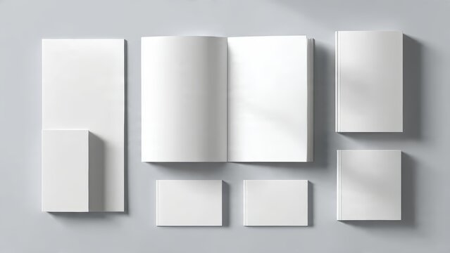 Various blank white books and notepads in different sizes and orientations
