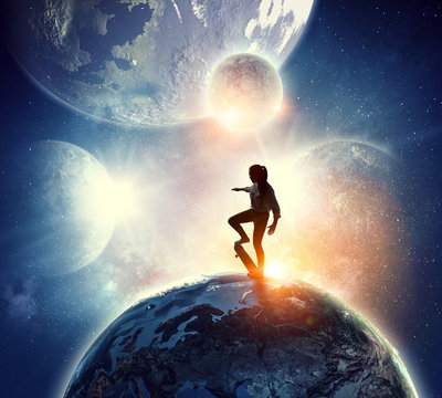 Young couple sharing messages on urban rooftop skate ramp with smartphones and earbuds