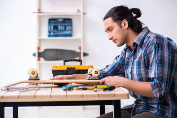 Young man repairing skateboard at workshop