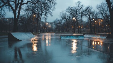 Blank mockup of a hybrid indooroutdoor skatepark design with a mix of street and transition elements. .