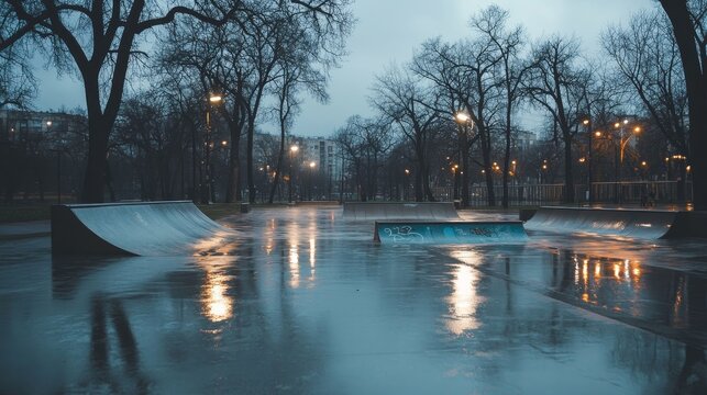stock photo of Modern outdoor skatepark structure with smooth surfaces