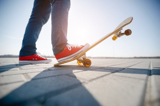 Youthful skater vibes walking on sunlit beach