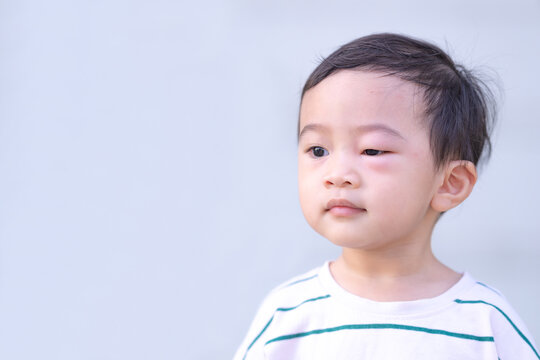 Asian baby boy is bitten by mosquitoes, allergy to insect bites unrecognizable swollen eye, Dermatitis problem of rash.Blank space for text.