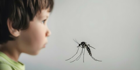 Scared cartoon boy faces large mosquito emphasizing insect protection and allergies. Concept Cartoon Characters, Fear, Mosquito, Allergies, Insect Protection