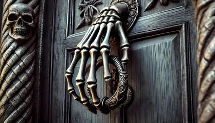 a spooky door knocker shaped like a skeletal hand gripping a ring