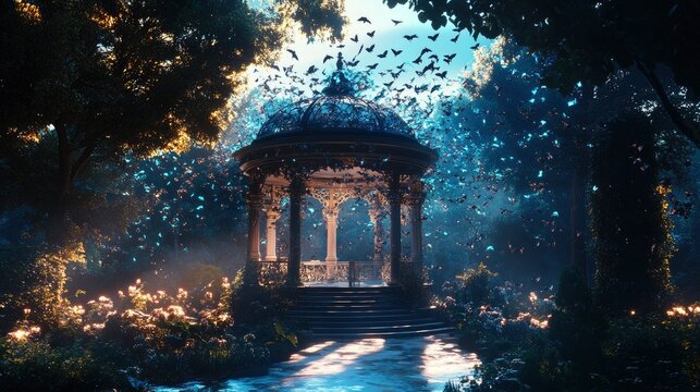 Enchanting garden gates with sunlit pathway and blossoming vines
