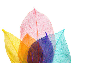 Blue sceleton of leaf on a white background. Artificial autumn leave, closeup, flat lay.