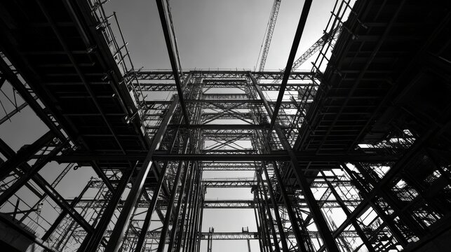 A massive steel beam extends toward the sky, held up by temporary scaffolding at a construction site. The skeletal framework showcases industrial engineering and design