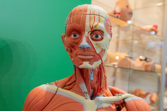 Detailed anatomical model of human back muscles, illustrating musculature for science, biology education