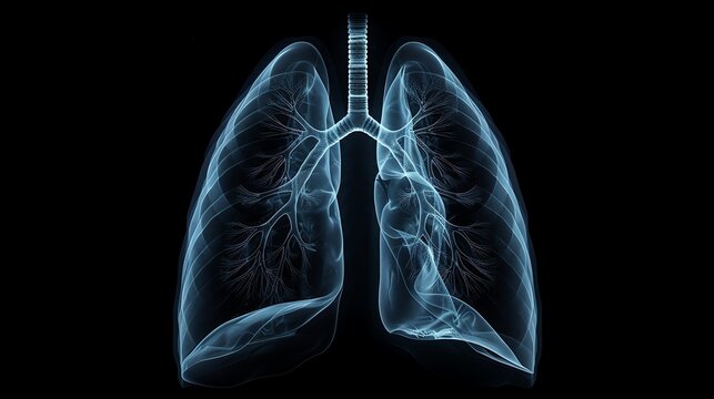 X-ray image of human lungs showcasing respiratory system anatomy in detailed blue monochromatic on black background.