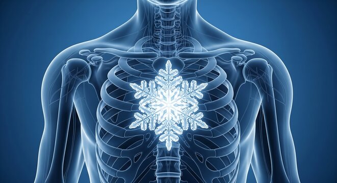 Human skeletal system with a glowing snowflake in the chest area