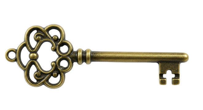 Ornate antique key isolated on transparent background, vintage brass skeleton key for decoration and design