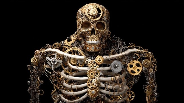 Steampunk mechanical human skeleton made of intricate golden and silver gears and cogs on a black background.