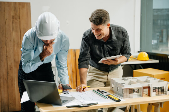Collaborating colleagues reviewing laptop screen with sticky notes and prototype sketches