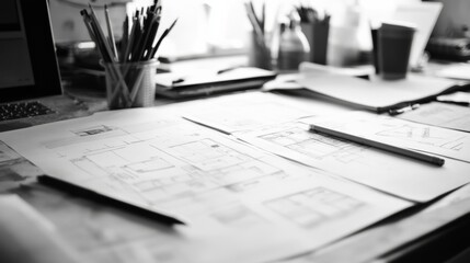 Close-up of creative artist sketching concept with pencil at wooden desk
