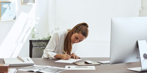 Back view of a young Indian female UX designer sketching wireframes at a cozy desk, surrounded by design tools and abstract UI elements, exuding creativity and professional focus.