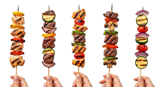 Assorted grilled cubed meat and cheese skewers arranged in rows on white background ideal for barbecues and snack appetizers