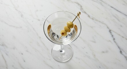 Elegant martini cocktail with olives on a skewer in a bar setting. Classic alcoholic beverage with cold fresh liquid. Party or celebration drink in bar or restaurant.