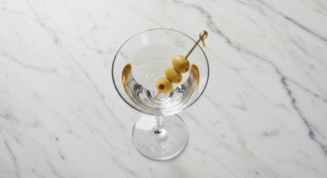 Sophisticated Martini with Olive: A crystal glass filled with a perfectly chilled martini, adorned with a plump green olive skewered by a toothpick.