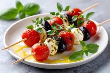 Caprese skewers with cherry tomatoes mozzarella olives basil
