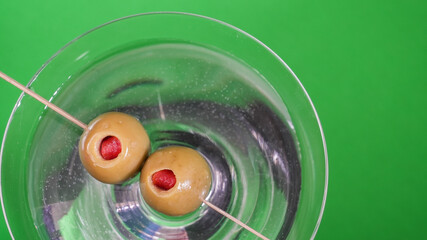 Cocktail with two olives served in a glass on a green background