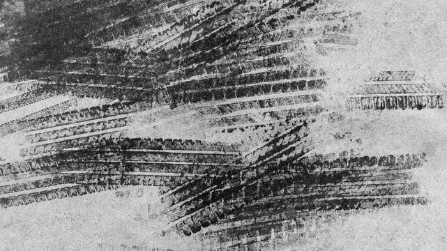 Black tire marks on road, Black rubber tire marks and tread marks, Tire trace track wheels texture and background, Auto tire tread grunge, Car wheel tyre tread track black tyre print, Top view.