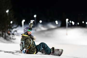 Snowboarder girl posing on slopes. Night skiing in winter resort..