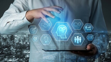 Head with gear and icons representing learning, digital training, and development process, showing skill growth for human or AI systems through knowledge or task optimization Marrow