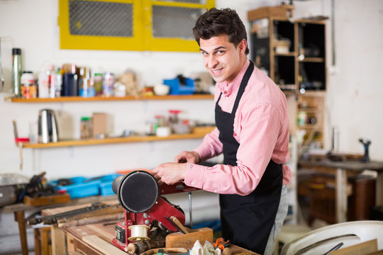 Carpenter woodworking with belt sander in workshop