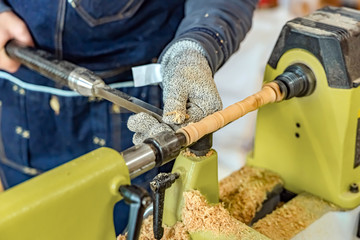 Carpenter man is carving the wooden stick. Spinning wood wheel machine. Trimming forming a round detail. Joiner is using metal tool to make the handmade decoration at workshop.
