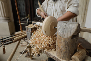 Shallow depth of field (selective focus) details with a craftsman using an ancient Roman woodturning lathe to make a bowl during a historic reenactment event.