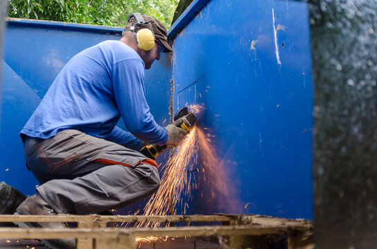 Craftsman Cutting Metal Column With Grinder Outdoors. Man using a grinder on a metal column, creating sparks