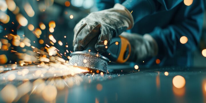 Close-up of a worker using an angle grinder in a workshop with protective gear