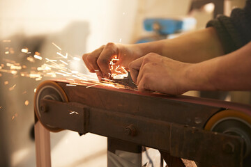 A knife maker sharpening a blade on a grindstone, sparks flying as they hone the edge to perfection.