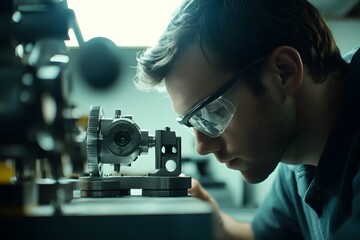 Skilled worker operating a high precision grinding machine in a contemporary workshop focusing on the intricate details and craftsmanship of metalworking processes
