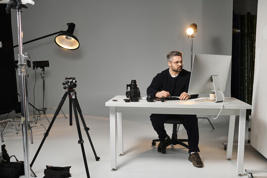 Photographer capturing sunset in golden hour landscape, artistic expression