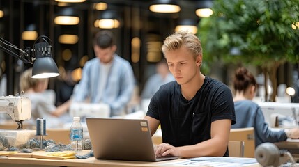 Skilled artisan focuses on sewing fabric carefully, using a designer machine in a well-equipped workshop. The atmosphere reflects dedication to craftsmanship and innovative design