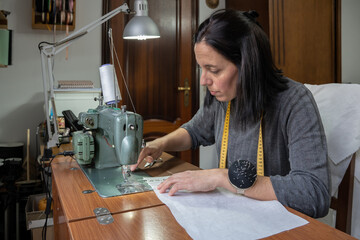 Skilled seamstress in her workshop crafting clothing using a traditional sewing machine for unique handmade fashion designs.