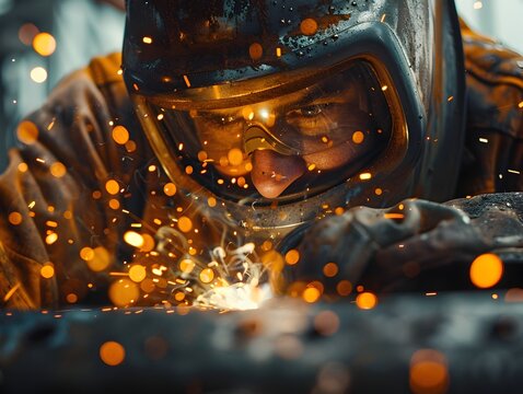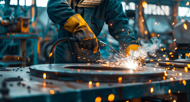 A welder in protective gear is captured in the midst of his craft, focusing intently as he welds a large metal component. Sparks fly around him in an industrial workshop