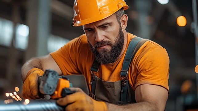 Skilled Worker Using Angle Grinder In Heavy Industrial Workshop Images
