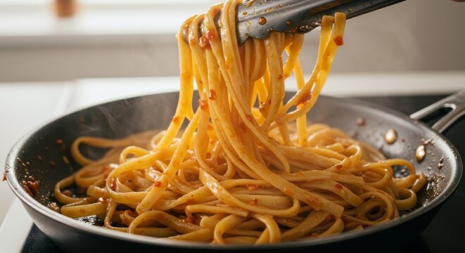 Pasta in skillet with chili garlic butter tongs lifting noodles